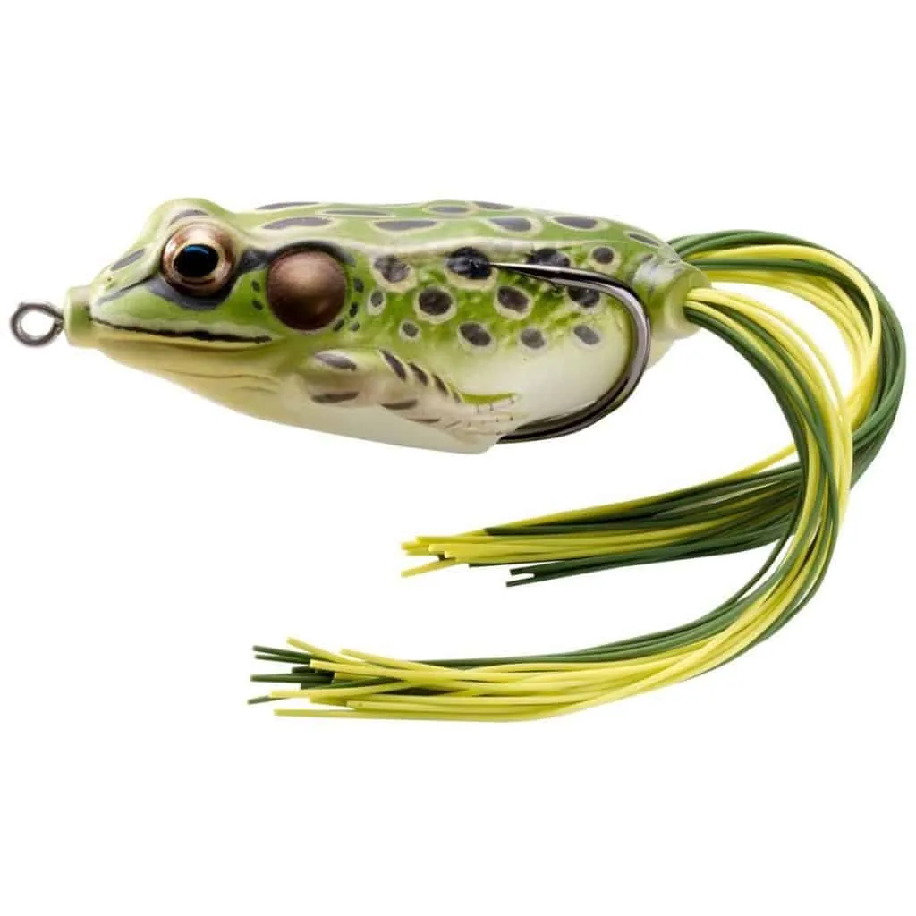Floating frog lure with weedless hooks, perfect for topwater strikes in grassy, shallow freshwater environments like lakes and ponds.
